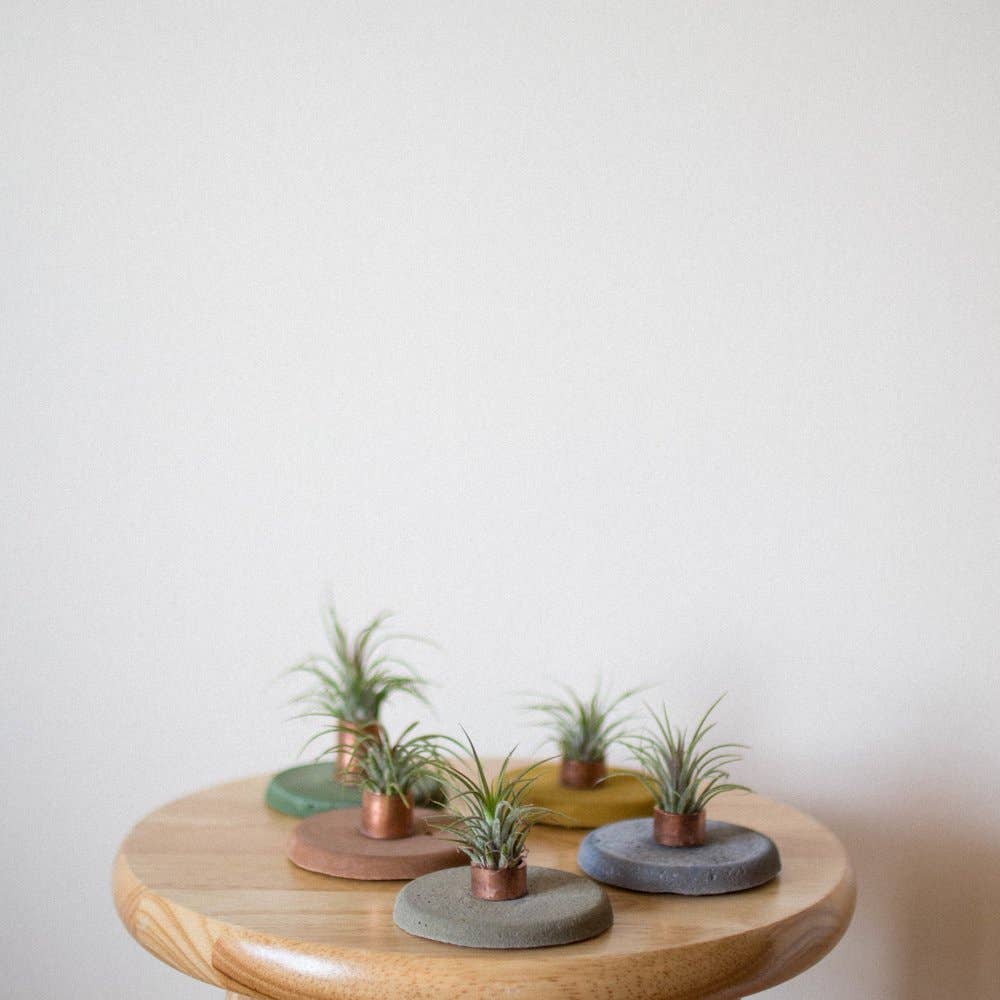 Modern cement airplant holder with copper accent. Buff white color pairs perfectly with any aesthetic. 4" wide, by 1" high.
