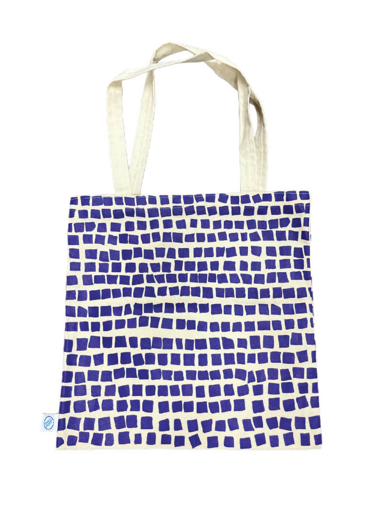 Flat style tote bag that was hand printed and sewn by Fair Trade. Features a handcut square pattern and is available in royal purple.