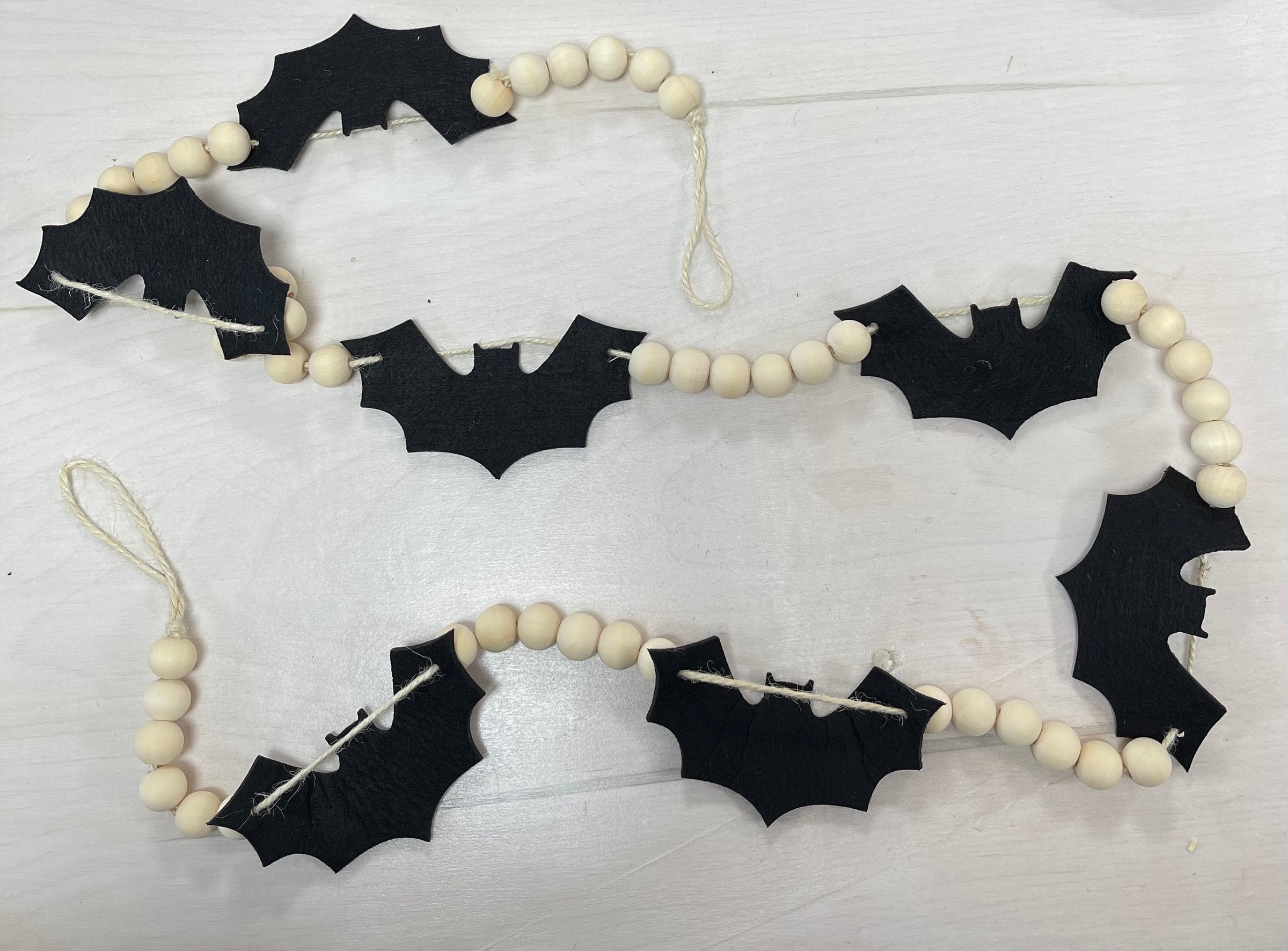 Feeling batty? Decorate with this wood bead and felt bat garland. Loops on either end for easy hanging on the wall or over entryways. Measures 52.5" length.-