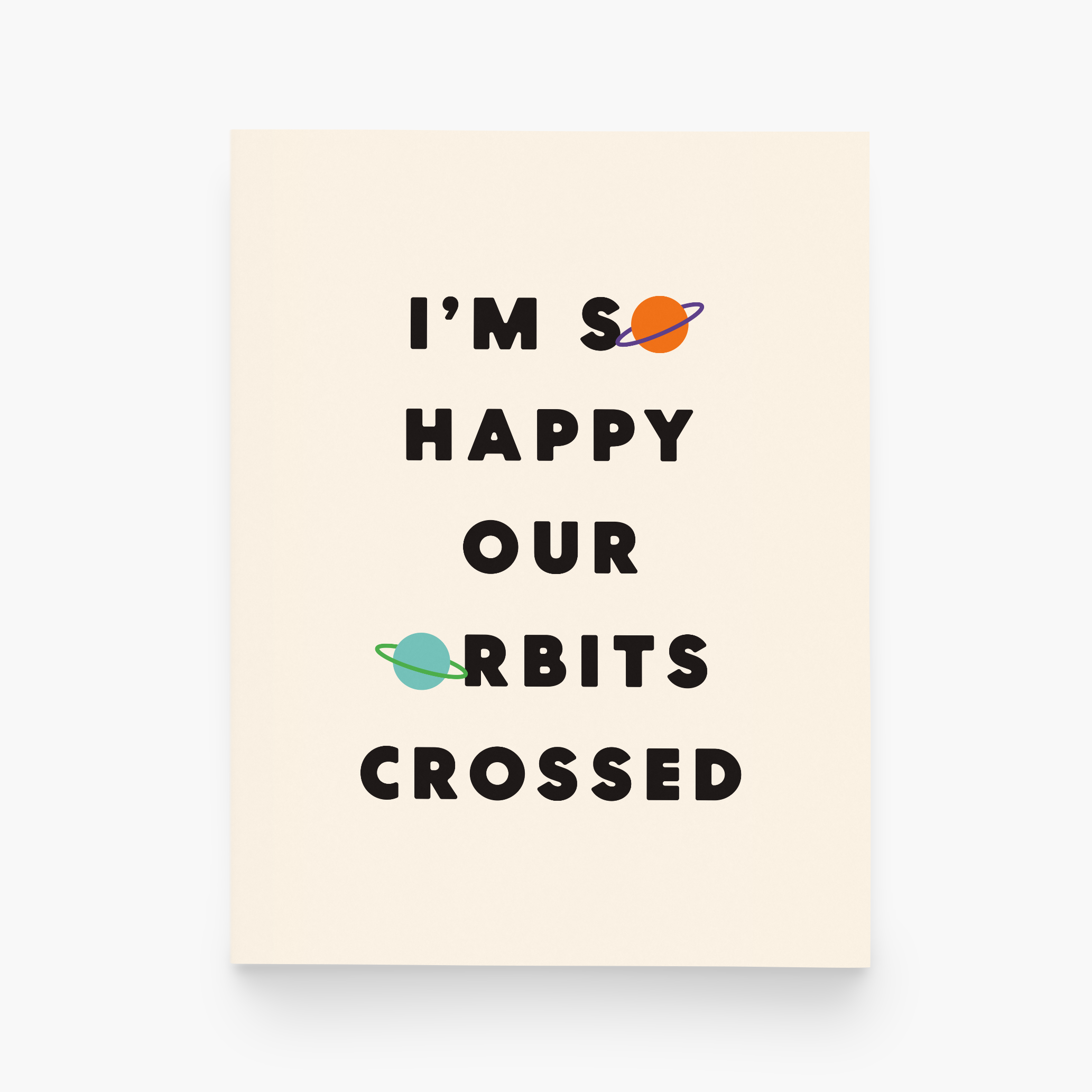 • A2 (4.25" x 5.5") greeting card printed on off-white eggshell paper • Comes sleeved with an off-white envelope • Blank on the inside for room to write a personal note • Let me know if you'd like your cards to be naked (without sleeves) Ever thought the cosmos had a hand in your love story? Our 'I'm So Happy Our Orbits Crossed' card is just the ticket for expressing that celestial sentiment. Perfect for lovebirds who enjoy a good space pun or simply adore quirky, heartfelt messages. So, whether they're a stargazer or just a sucker for original love notes, this card is sure to launch their day into the stratosphere.-