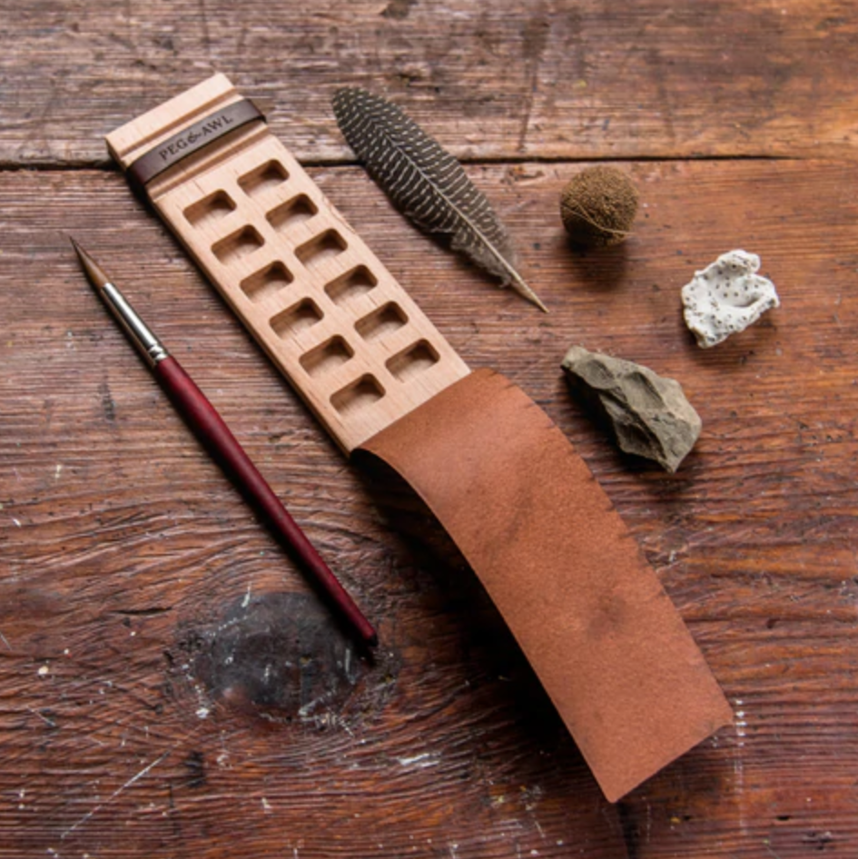 Peg & Awl's Iris Painter’s Palette was inspired by the ivory palettes used by the ancient Egyptians. Constructed from sustainable maple and vegetable-tanned leather, the palette is a simple way to transport your favorite paints, whether you mix your own pigments or squeeze them from a tube.