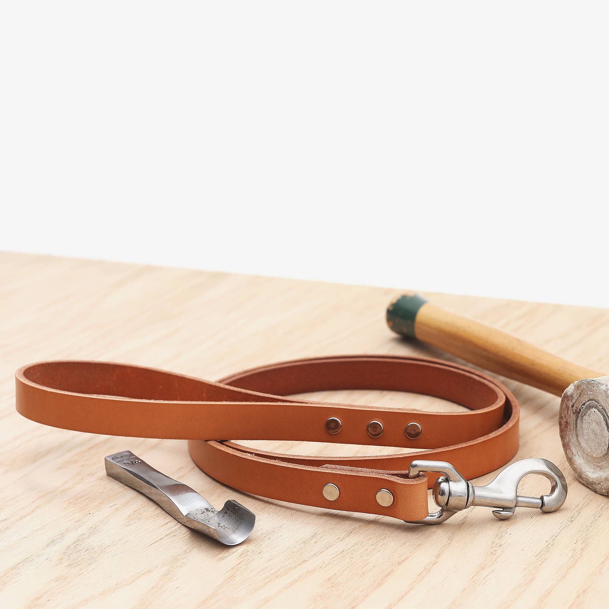 This Tan Leather Dog Leash features a classic and durable leather design that will last you for years to come! It is fitted with a highly polished solid brass snap hook for a timeless look. This thick, full grain English bridle leather is beveled and hand polished in New Mexico, USA. Measures 5 feet long.-