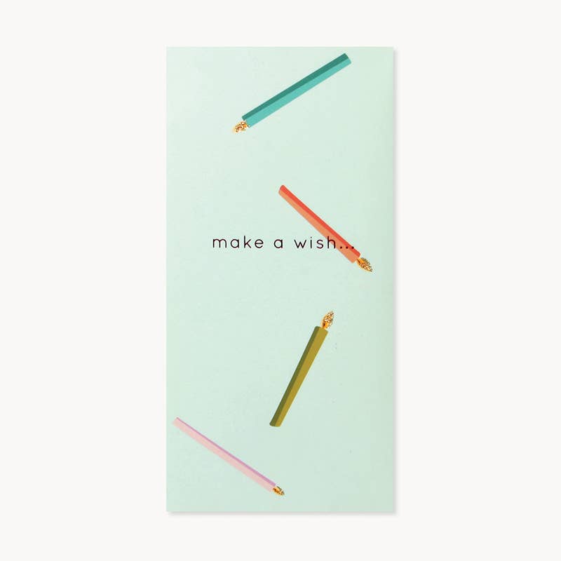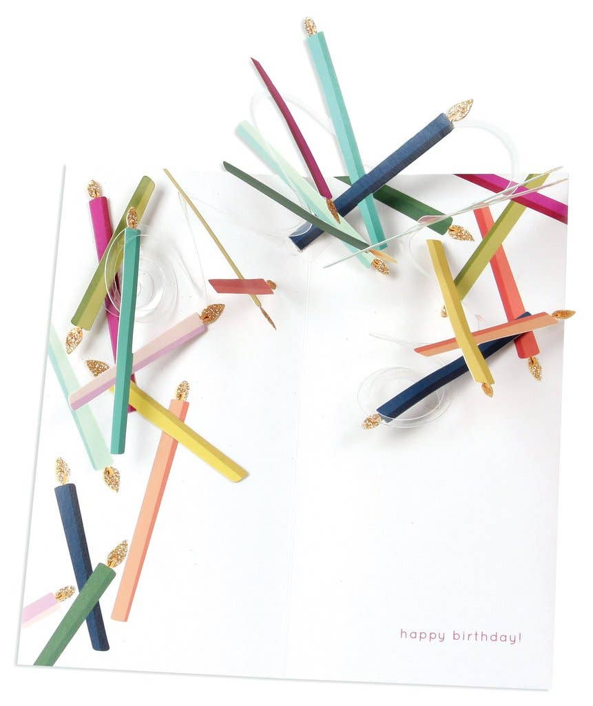 Flickering birthday candles scatter merrily as the card unfolds. The flames are dusted with bronze glitter for extra twinkle in this paper-engineered, die-cut greeting card. Featuring bronze glitter, gold foil & a rich plum envelope. Front Greeting: make a wish. Inside Greeting: happy birthday.-