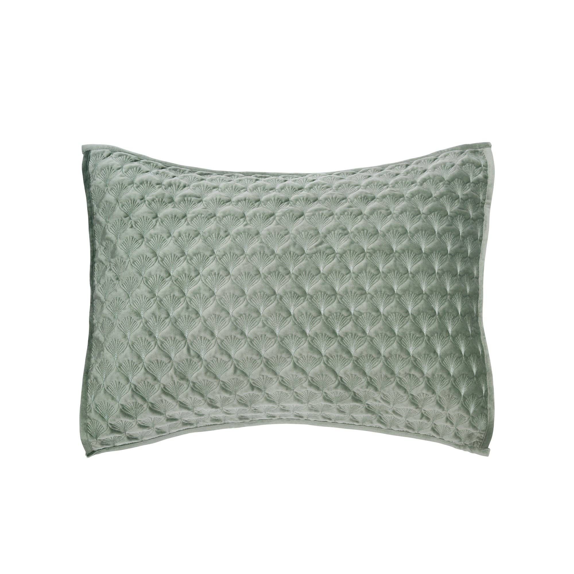 The Merano Quilted King Sham by Levtex Home is inspired by an updated take on a traditional fabrication. Offered in seafoam green, this design will immediately transform your bedroom. These shams feature soft, luxurious green velvet quilted in a gorgeous scalloped leaf pattern on the front, reversing to a matching microfiber on the back. The King Sham (36x20in.) is microfiber, quilted with a soft hypo-allergenic polyester filler and is machine washable. Pillow inner not included. Enjoy this for years to come!-