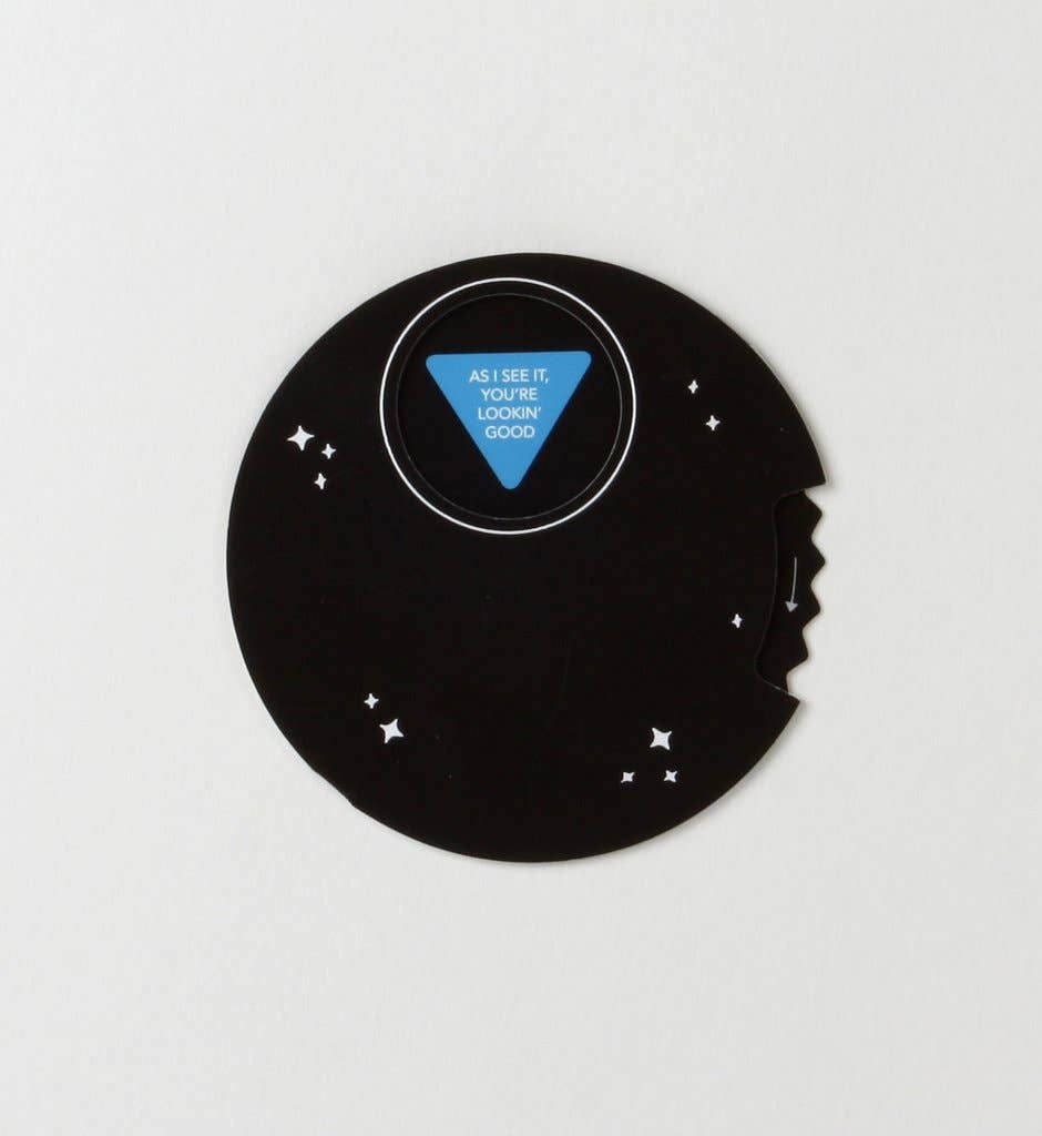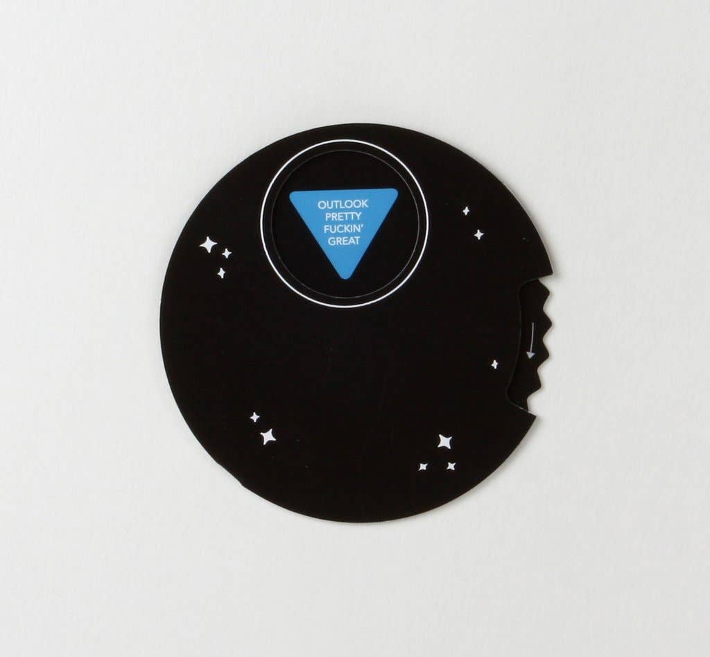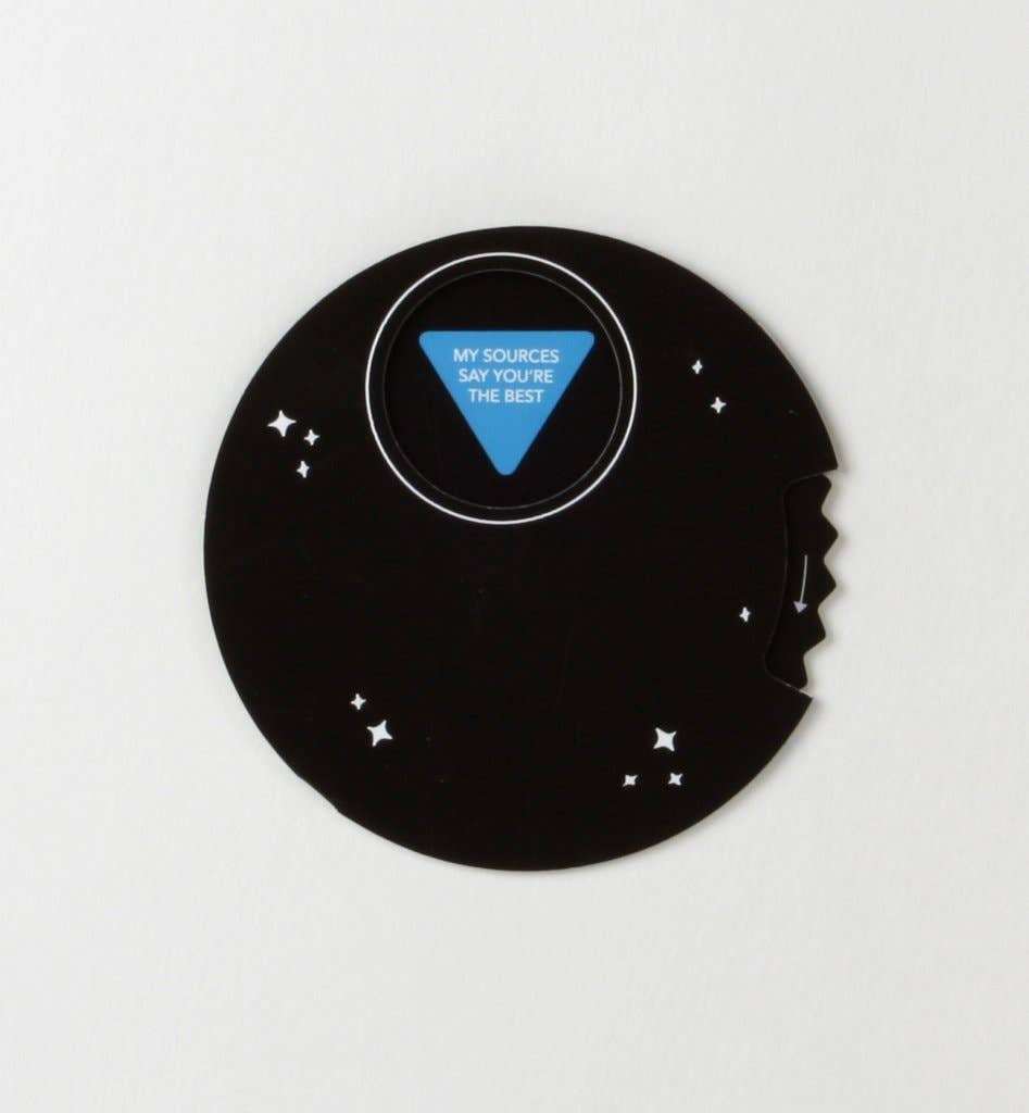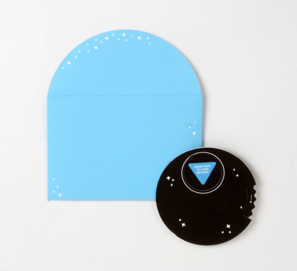 Turn the wheel to reveal your fortune in this paper-engineered pop-up greeting card. Featuring blue envelope with star print and black foil. Greetings: signs point to a rad birthday, outlook pretty fuckin' great, as I see it, you're lookin' good.-