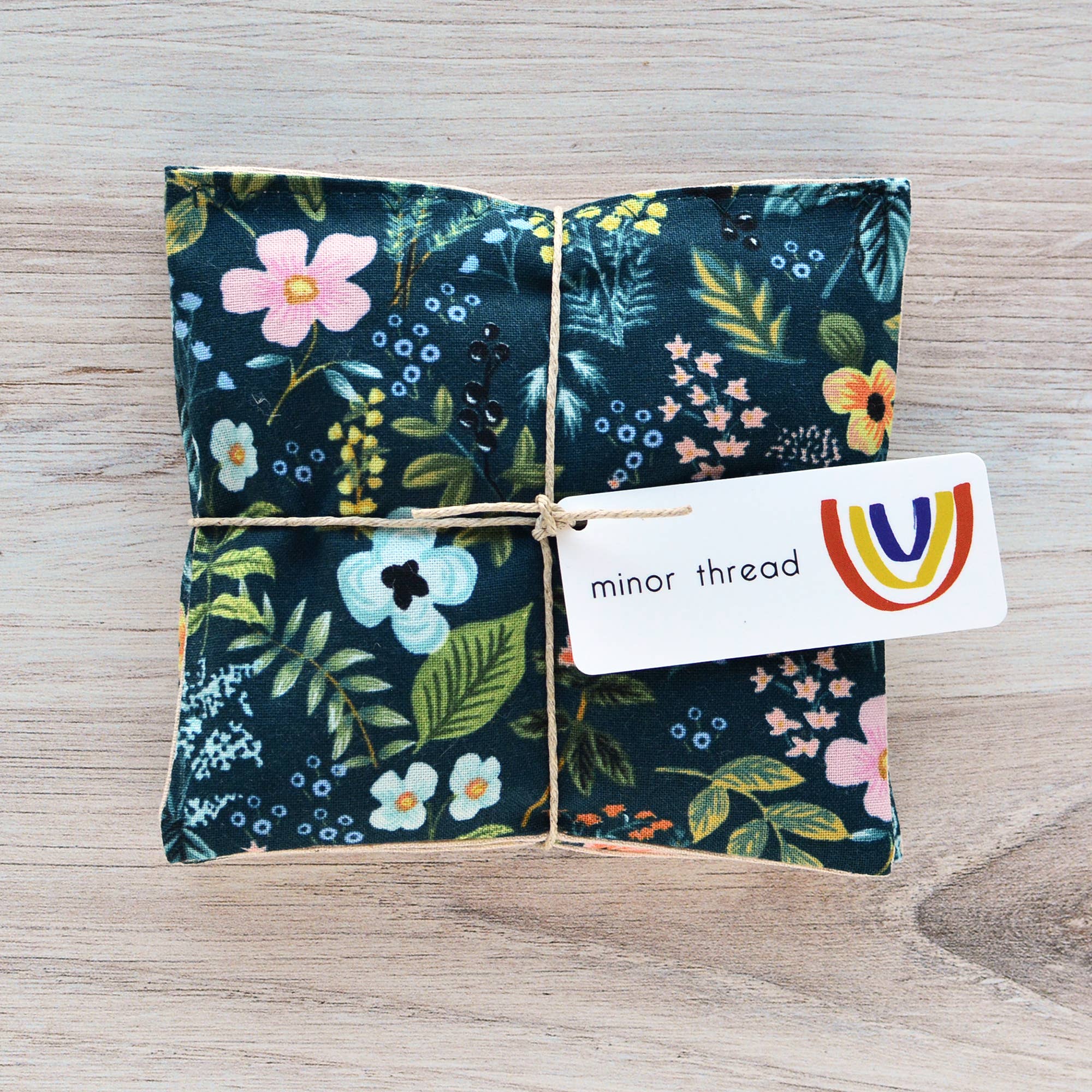 Each sachet is approximately 4 1/2" x 4 1/2", filled with 4 oz. (by volume) of organic lavender flowers. These sachets are made with fabric from Rifle Paper Co.'s 'Amalfi' collection with gorgeous, multi-color florals on deep teal cotton, backed with natural linen.
