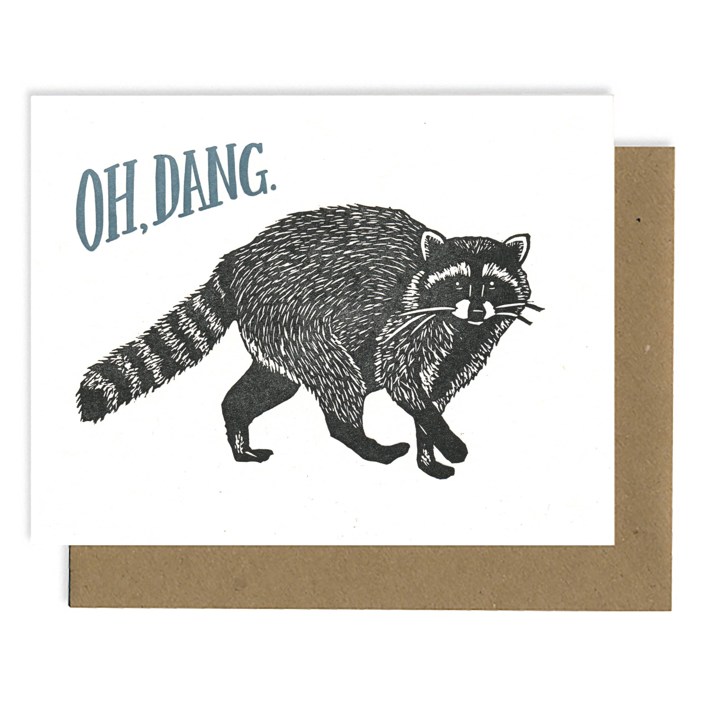 This letterpress-printed card features a hand-carved linoleum block print of a raccoon in black ink. The words “oh dang.” are printed in blue using modern letterpress techniques. Blank inside. Comes with kraft envelope. A2 size.-