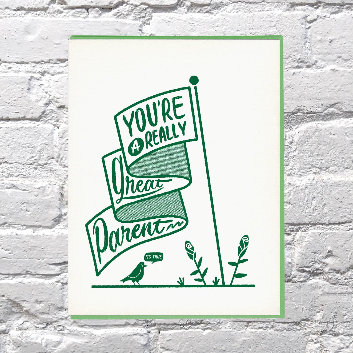 Moms, Dads, non-binary parents - let them know they’re doing a great job. One blank card, letterpress printed, with coordinating envelope. Size A2: (4.25"x5.5") Hand printed on an antique letterpress in a cozy little studio.-