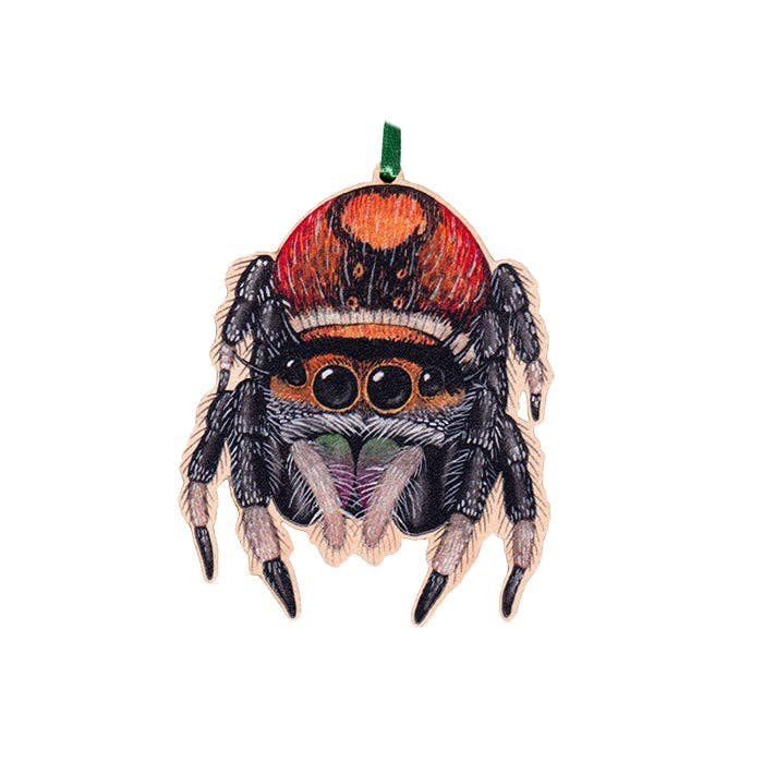 This keepsake ornament features a Regal Jumping Spider. The vibrant image is printed on 4mm thick maple wood, measures approximately 3" tall, and is precisely lasercut. The back is plain wood. It comes with a colored ribbon to hang. (Ribbon color varies.)-